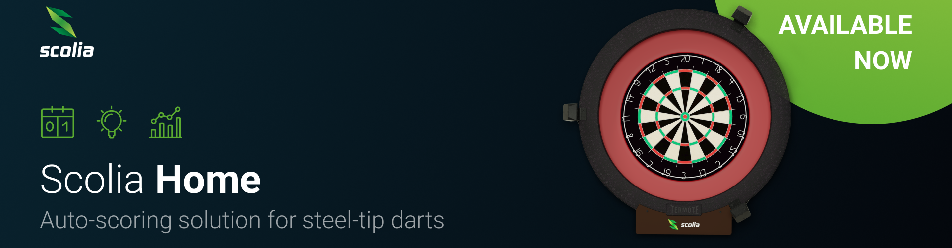 Scolia is an innovative automatic score-recording system for steeltip darts. In addition to keeping score, Scolia records the location of each throw with millimeter accuracy to provide coordinate-based statistics to players.